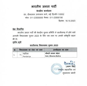 रायपुर। लंबे इंतजार के बाद छत्तीसगढ़ के लिए भारतीय जनता पार्टी ने तीसरी लिस्ट जारी कर दी है. इसमें केवल प्रत्याशी का नाम जारी किया गया है. इस लिस्ट में पंडरिया कॉसटेटेंसी से भावना बोहरा को भारतीय जनता पार्टी ने अपना उम्मीदवार बनाया है. अब छत्तीसगढ़ में भाजपा के 4 नाम बचे हैं, जिसका ऐलान यथा संभव एक दो दिन में हो सकता है.