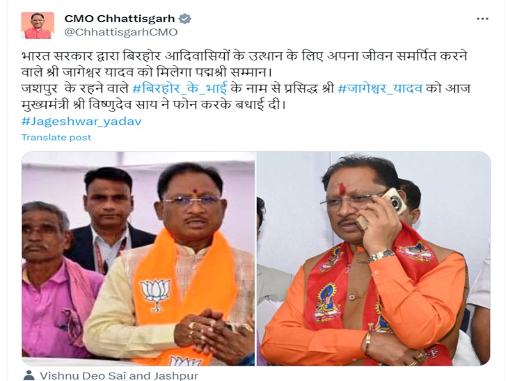 मुख्यमंत्री विष्णुदेव साय ने जशपुर के जागेश्वर यादव को फोन पर बधाई भी दी है। कुल 34 हस्तियों को अवॉर्ड दिया गया है।