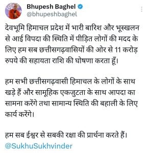 मुख्यमंत्री भूपेश बघेल ने कहा कि हिमाचल में भीषण प्राकृतिक विपदा आई है। ऐसे में हम सभी छत्तीसगढ़वासी हिमाचल के लोगों के साथ खड़े है।