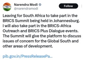 दक्षिण अफ्रीका रवाना होने से पहले पीएम मोदी ने अपने आधिकारिक X(ट्विटर) हैंडल के जरिए एक संदेश लिखा।